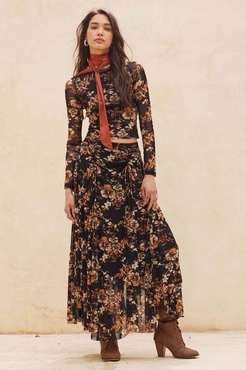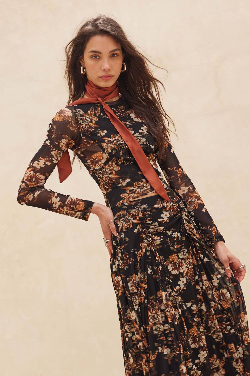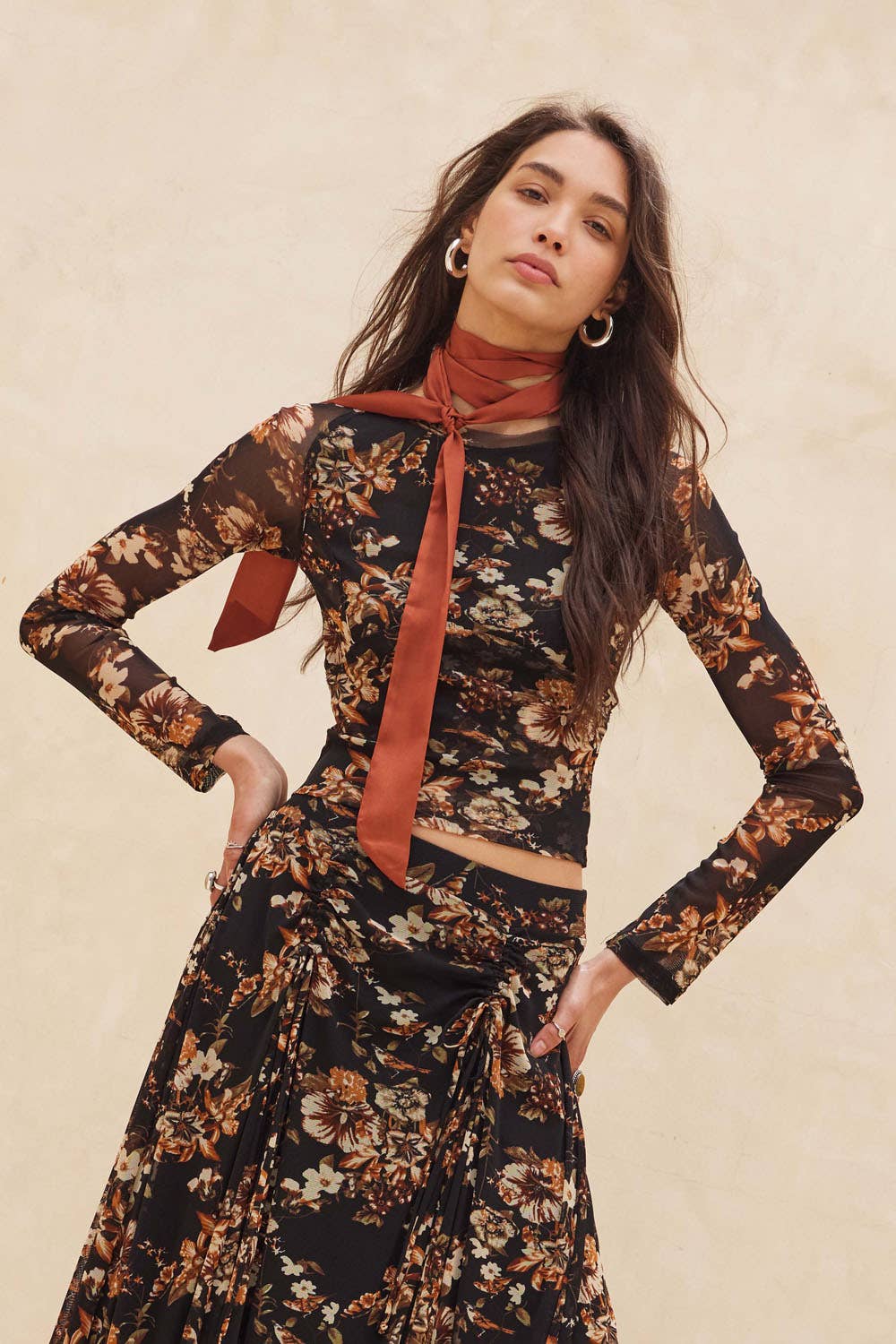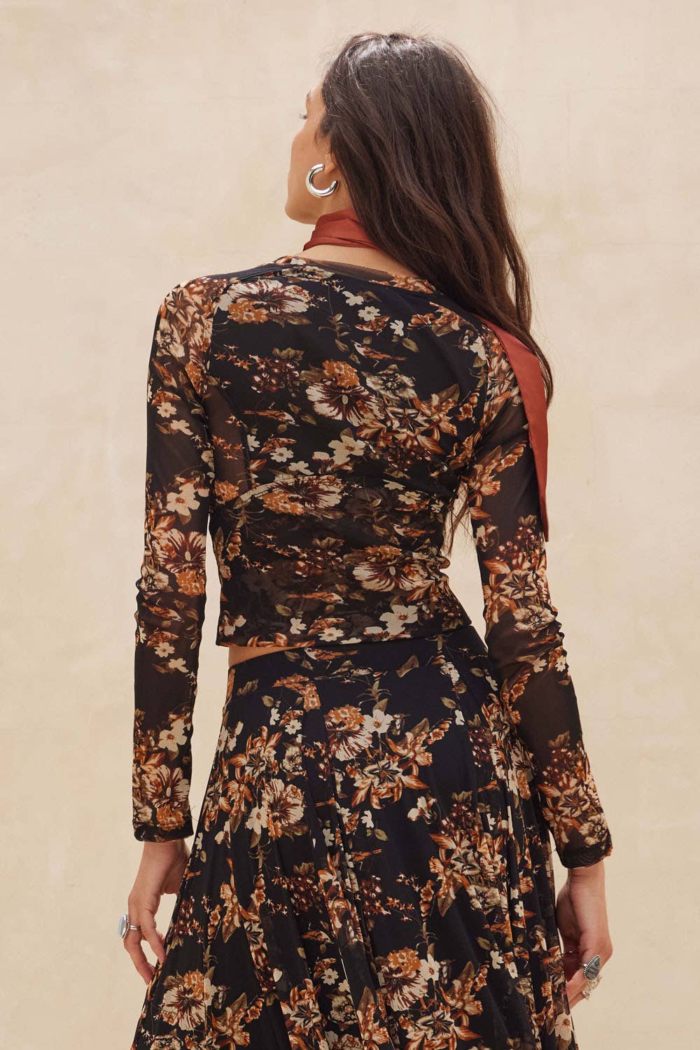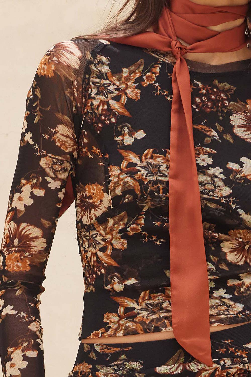 Delicate, yet undeniably bold. The Everly is a cropped, fitted mesh top with contour seams that sculpt and flatter the silhouette. Featuring a muted floral print, round neckline, and long sleeves, it’s partially lined for just the right amount of coverage. The paneled design adds quiet structure, making it as easy to layer under leather and knits as it is to wear on its own. A romantic statement piece with an urban edge—made for nights when the city feels electric.